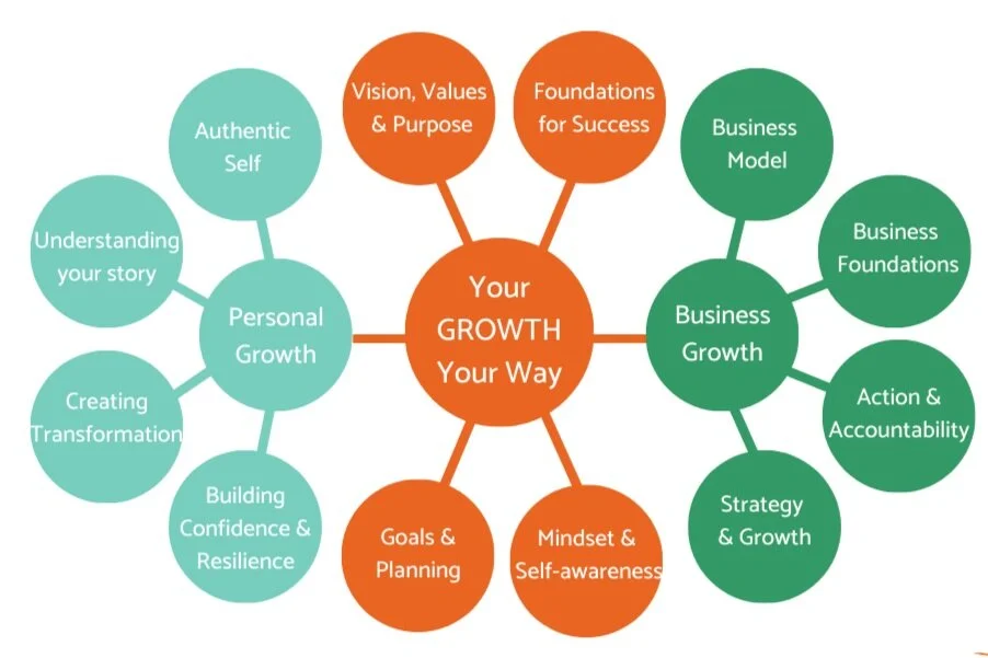 That’s where I come in…we’ll work together to create a path forward to bring your ideas to life. We’ll focus on both business and personal growth using my Your Growth Your Way model (below), because when you’re at your best so is your business!. Through coaching you’ll: